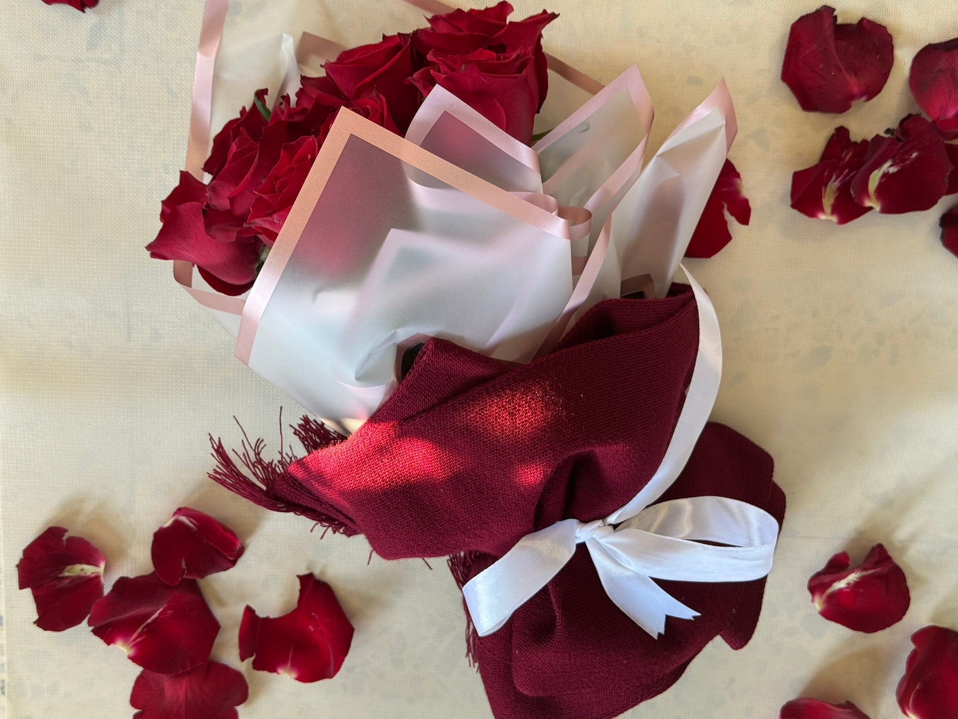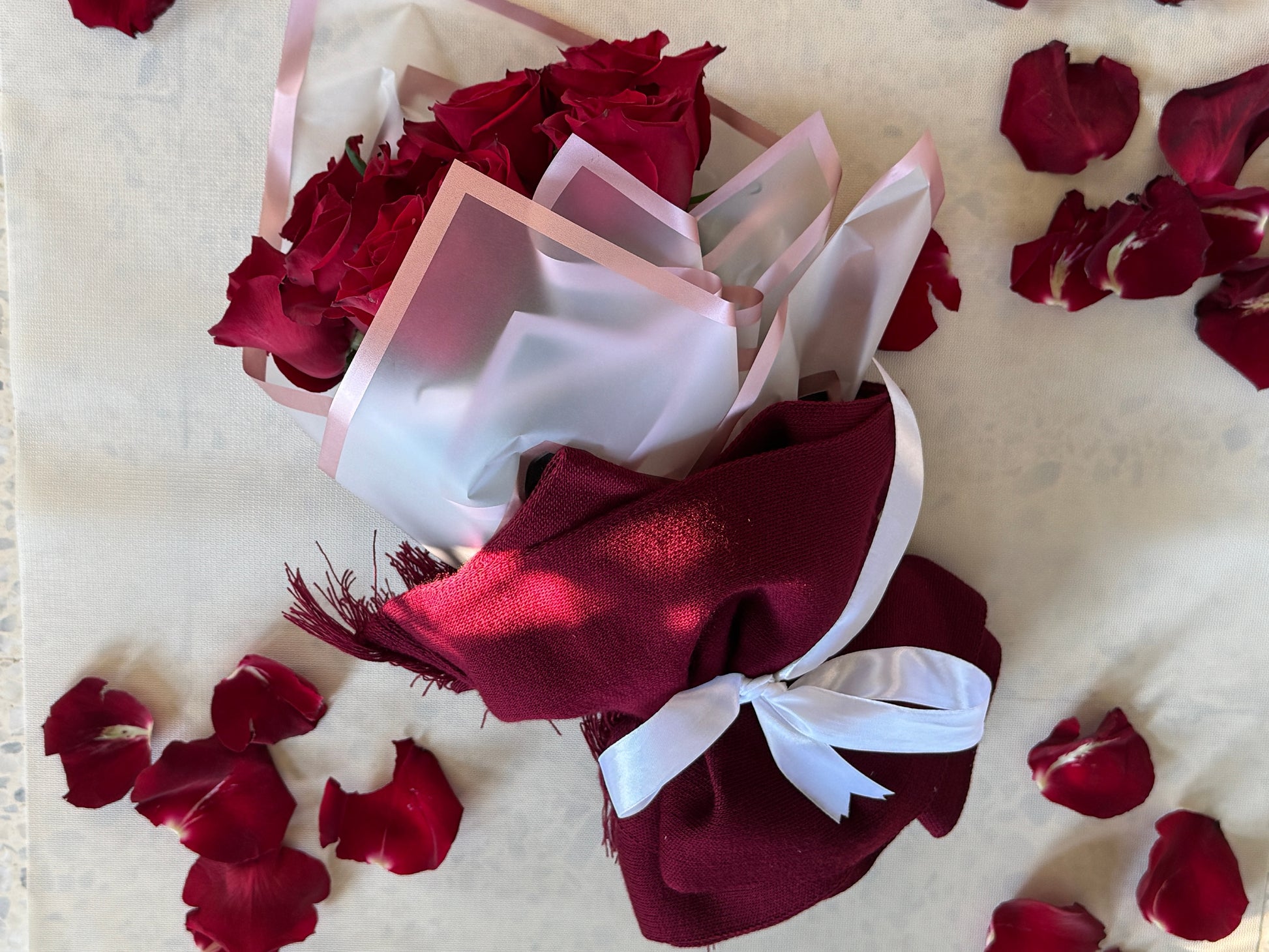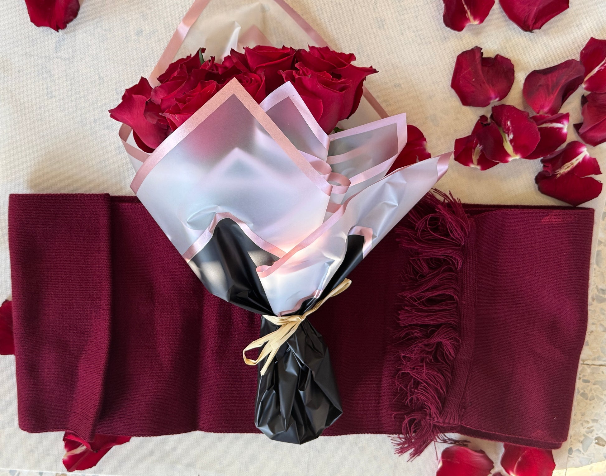 هدية تحمل معاني الحب والاهتمام. وشاح ميكاسا الفاخر مع باقة ورود طبيعية منتقاة بعناية